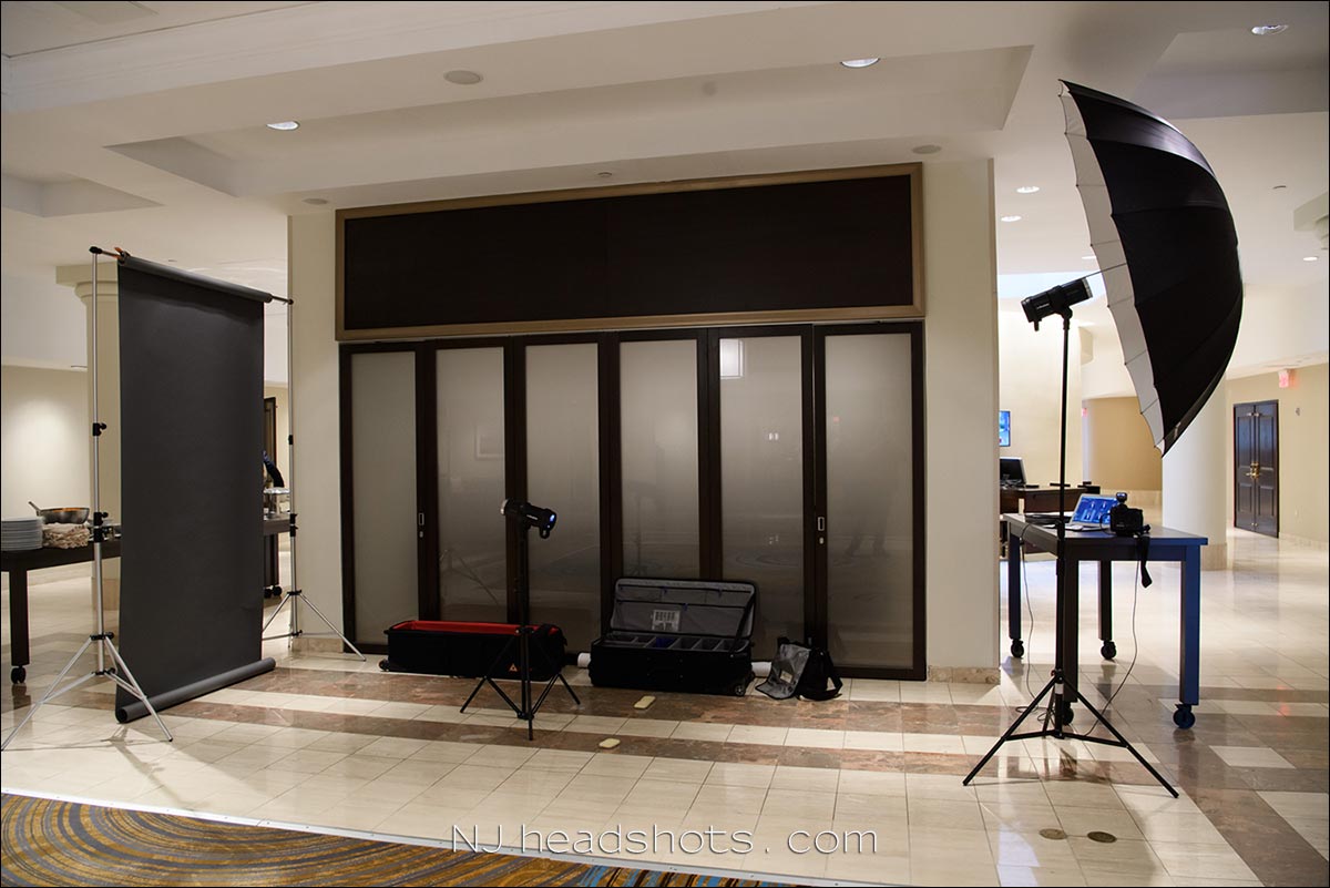 This was a fairly simple setup in a hotel lobby area. We had to shoot 15 headshots during the hour-long lunch break of a business meeting at an airport hotel. A quick setup; a few test shots; and we were up and running, and completed the shoot before lunch break was over – including image selection. With this, the photo session wasn’t an interruption to the event.