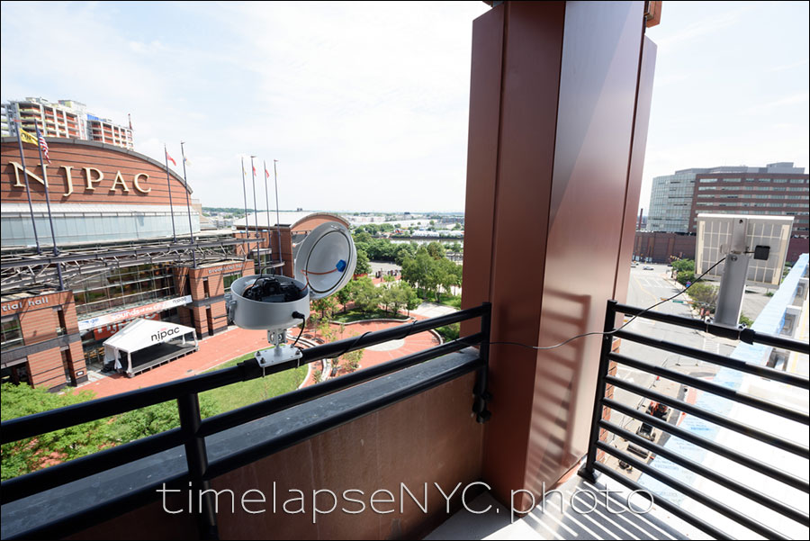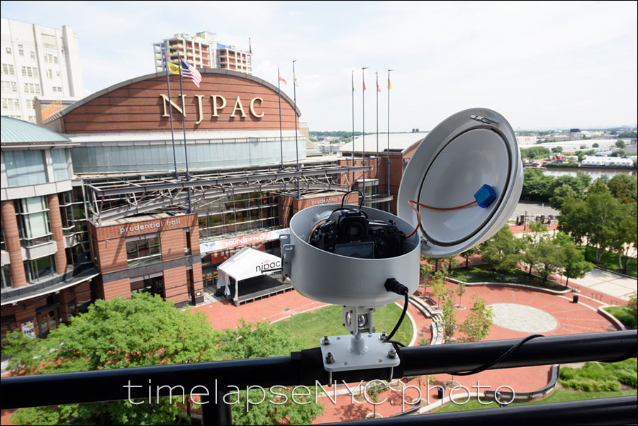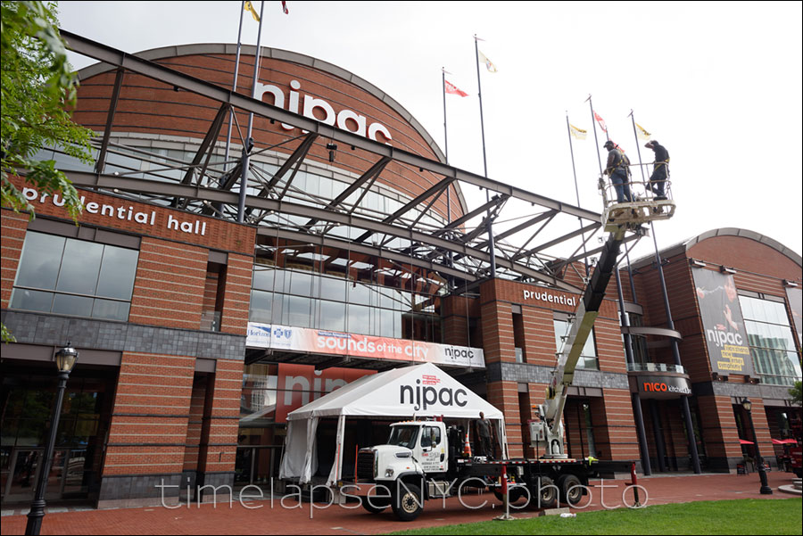 I have several outdoor time-lapse projects running, of which the long-term time-lapse project at Port Newark Container Terminal has been running for the longest – about 3 years by now! Long-term timelapse need not be that long though.Here is a time-lapse installation that I set up for NJPAC to record the final step in their rebranding transformation – replacing the large letters of their logo in front of the NJPAC building.
