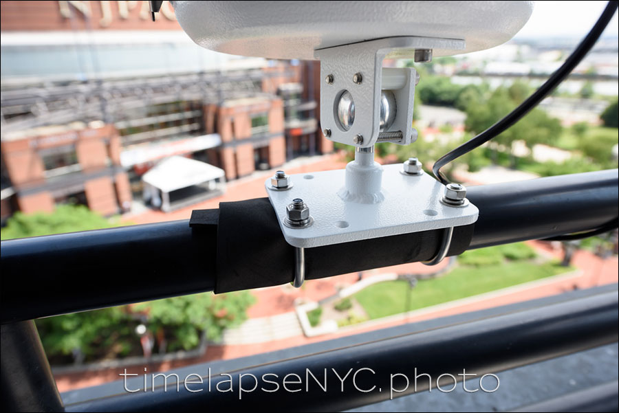 The property manager of the building where we mounted the camera across the street from NJPAC, was concerned that the camera mount and the solar panel mount don’t damage the brand-new railing of the apartment. I therefore took care to sufficiently pad the mount so that there wouldn’t be any marks on the railing.