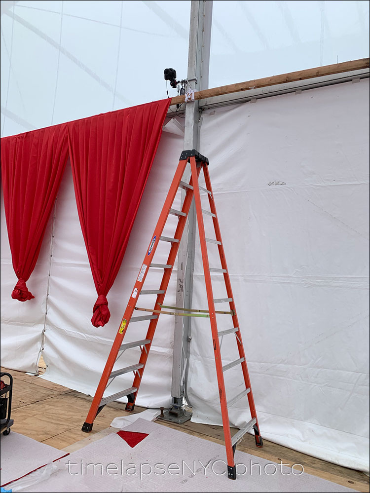 Then when the tent was erected, and the decor inside was about to be properly started, I moved a camera inside the tent. Since we were now working indoors, away from the rain and elements, I didn’t need a weather-proof housing. I mounted the camera as I high as I could on one of the main beams, to get a high viewpoint of the event unfolding in front of us.