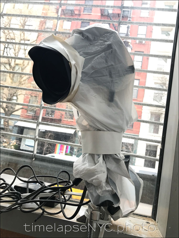 Then the other challenge was dust. I had to protect the cameras from the dust from the carpentry and painting and the finishing of the new drywall. This is one of the cameras, as I mounted them and covered them up in a large plastic trash bag to protect them from the construction dust. To get the proper view angle set on the camera, I used an external monitor, similarly as shown in this time-lapse project: Emerge212, New York.
