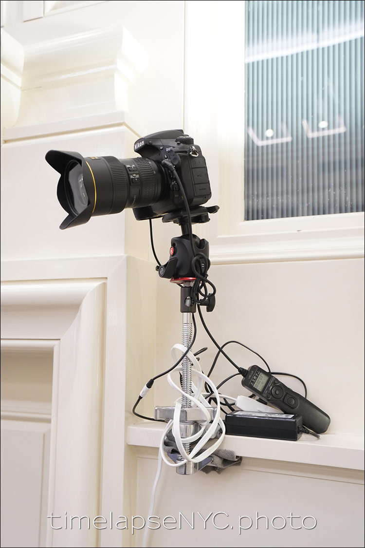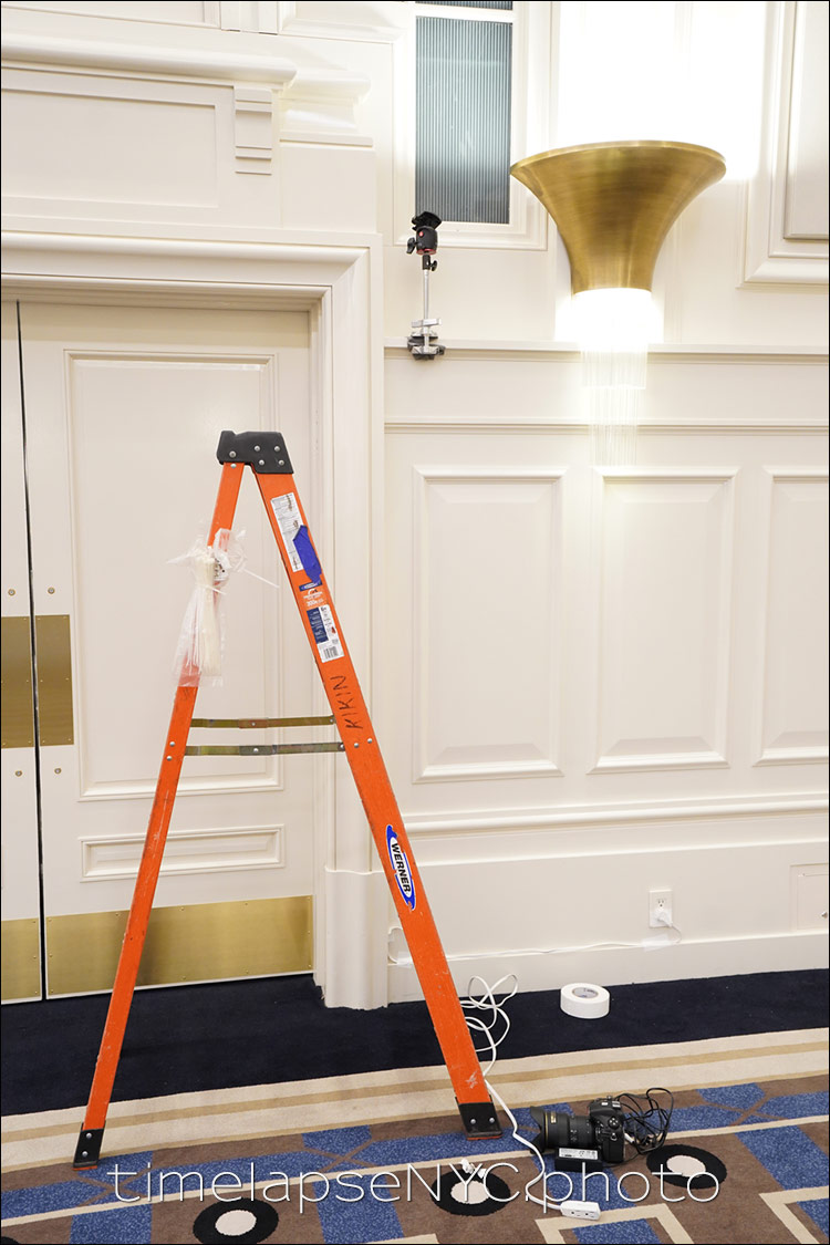 To have the cameras out of the way of staff members, and the eventual guests, the cameras were clamped securely to a ledge above people. Out of the way. In the detail photo of the camera, you can see that the clamp was used with padded material to make sure that none of the paint work or wood were damaged. The power cord running down to the AC outlet, was neatly taped away with white gaffer tape. Gaffer tape leave no residue, and also doesn’t pull any paint off.
