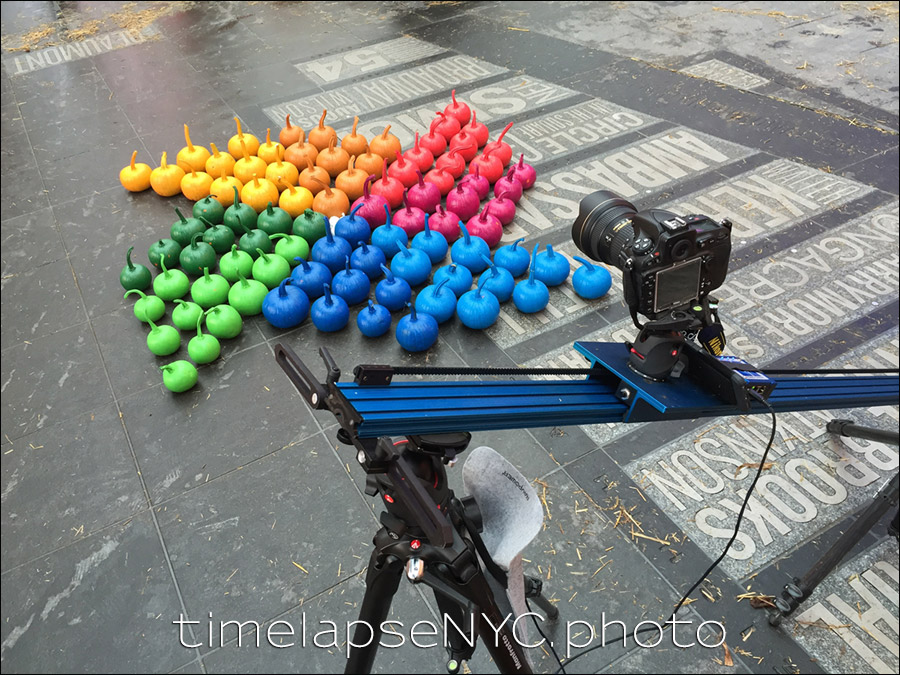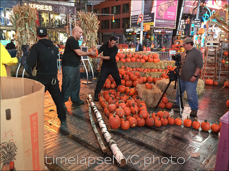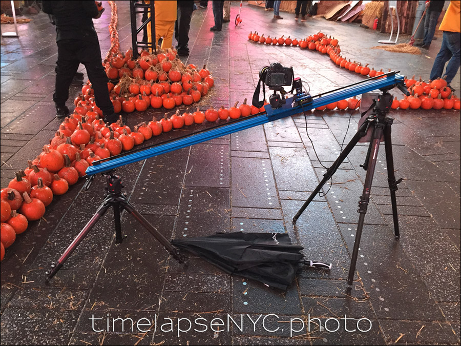 Every time-lapse project brings its own set of unique technical challenges that have to be met. It starts with the planning for the shoot based on the client’s brief, but there is also on-the-go problem solving as the time-lapse photo shoot shapes on the day. On October 29th, 2015, the Google Photos Pumpkin Patch was constructed in Times Square. The construction of the pumpkin patch took place during the night before, and there was a heavy rainstorm. The time-lapse photography had to happen regardless of that, and we had to work around the weather and still keep up with the team of people building the pumpkin patch! Of the total of 20 time-lapse sequences shot of the entire event as they built the pumpkin patch, two were finally used as the intro to Google Photos’ promotional video.