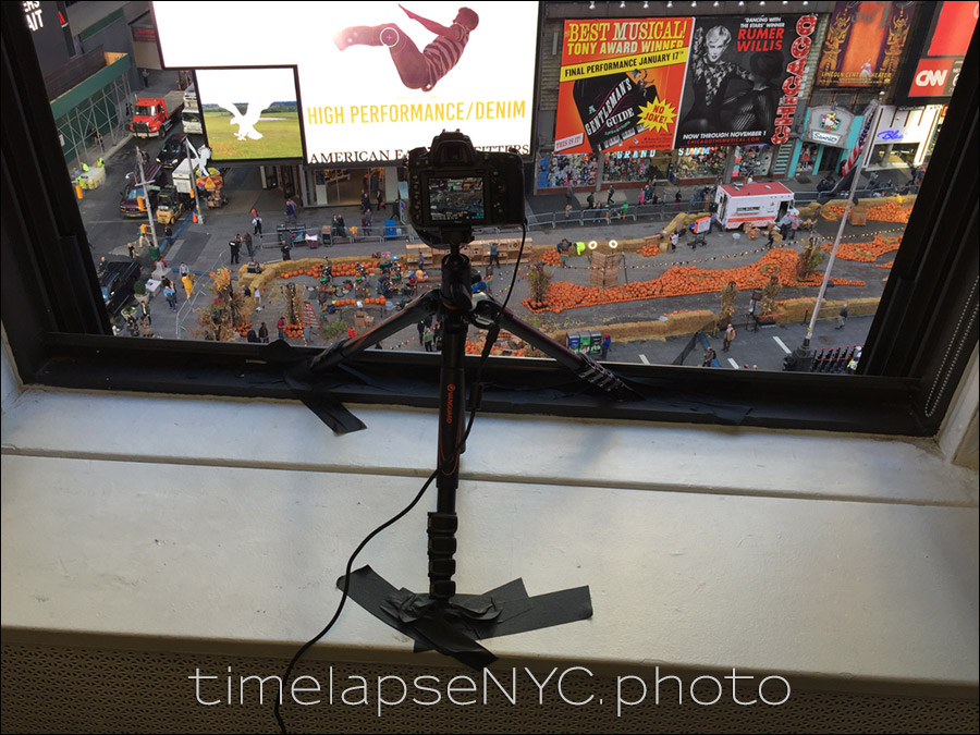 The video above is a compilation of some of those time-lapse sequences, to show how it all unfolded. I used four cameras – one cameras was set up in one of the offices with a view of Times Square. The other three cameras were “roaming” cameras, and was moved depending on where the action was. I used a motion-controlled dolly to give a cinematic sweep to some of the sequences, as well as a rotational controller to give a wider view of the events. Some behind-the-scenes photos to show some of the setups are shown below.